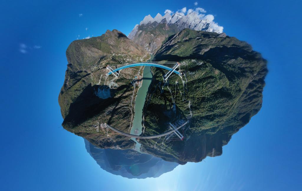 ↑ 丽香铁路金沙江特大桥(无人机球形全景照片,2023年11月25日摄)。