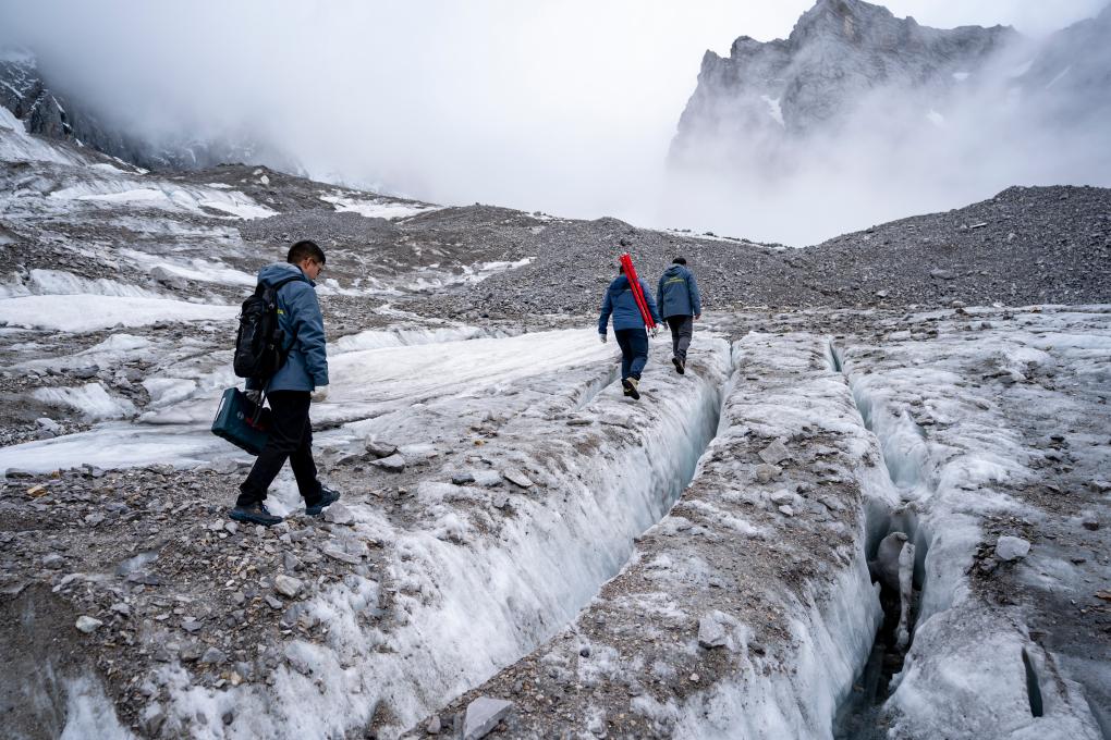 为记录下科研人员监测冰川的工作身影,我们跟随他们的脚步,先后两次登上玉龙雪山。科研人员需要携带各种科研装备,先坐缆车至海拔4506米处,再步行攀登至海拔4680米处,然后离开步道,进入科研观测区域。由于巨大的冰体表面多被冰碛物覆盖,走在白水河1号冰川之上,如果不仔细分辨,根本无法发现这与寻常的山体有何不同。