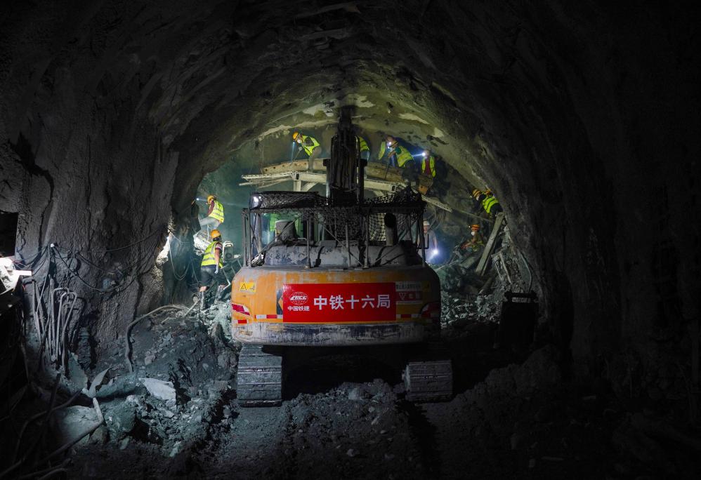 ↑ 工人在哈巴雪山隧道内施工(2022年7月27日摄)。