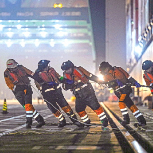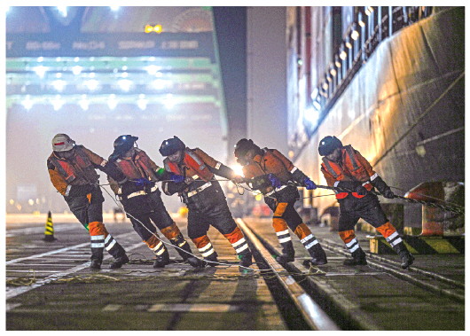 ▲一月十六日,工作人员在为刚靠泊码头的“巴赫”号集装箱班轮固定缆绳。 新华社记者赵子硕摄