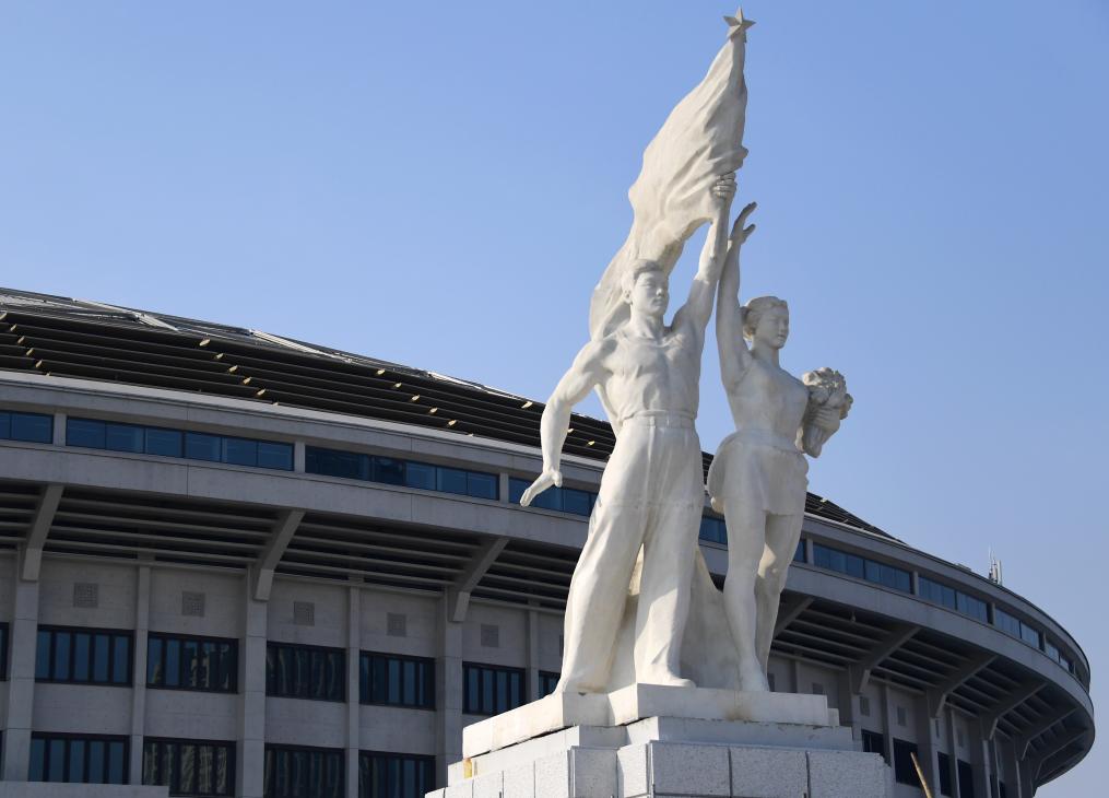 ↑2023年3月31日拍摄的北京工人体育场外的“迎宾”雕塑。