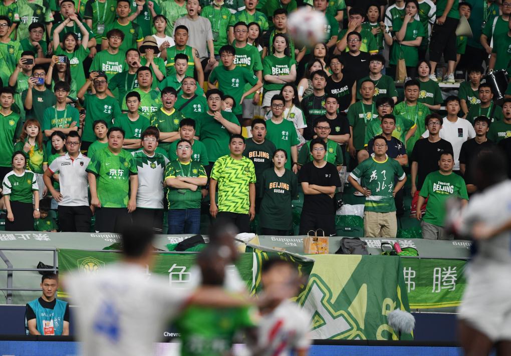 ↑2023年8月19日,北京国安队球迷在新工人体育场看台观赛。