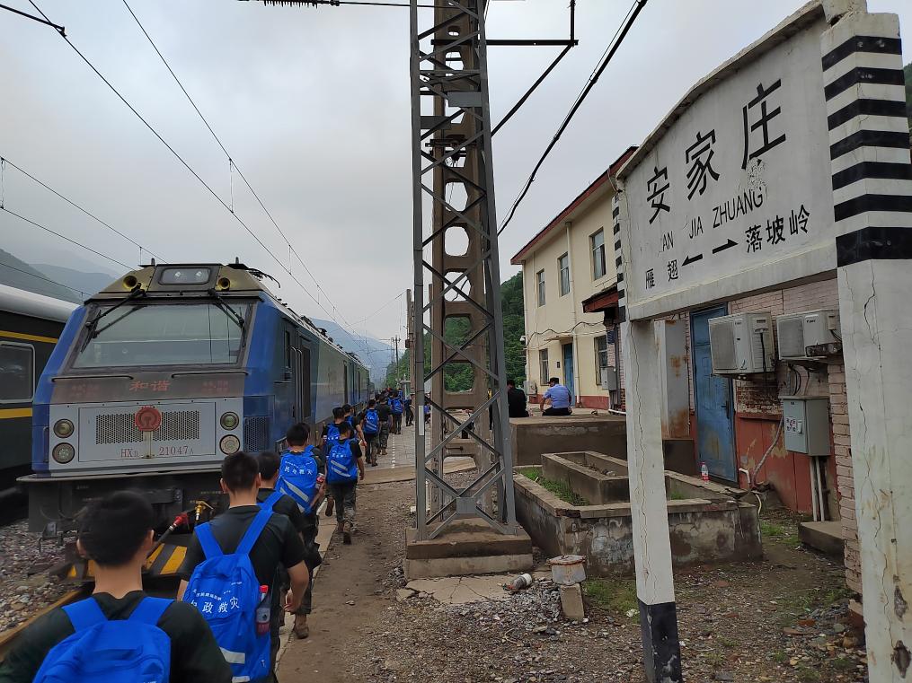 两个半小时后,我们成功抵达安家庄村!在与国铁集团现场工作人员沟通后得知,目前还有最后一批184名旅客滞留在此,多数都是老幼弱孕等重点旅客,其中有5位特殊旅客需要担架转运。被安置在安家庄村的Z180次列车受困旅客与照顾他们多天的村民挥手告别,转运行动开始,武警战士与滞留旅客沿铁路向落坡岭火车站前侧7号隧道5公里处徒步前进。
