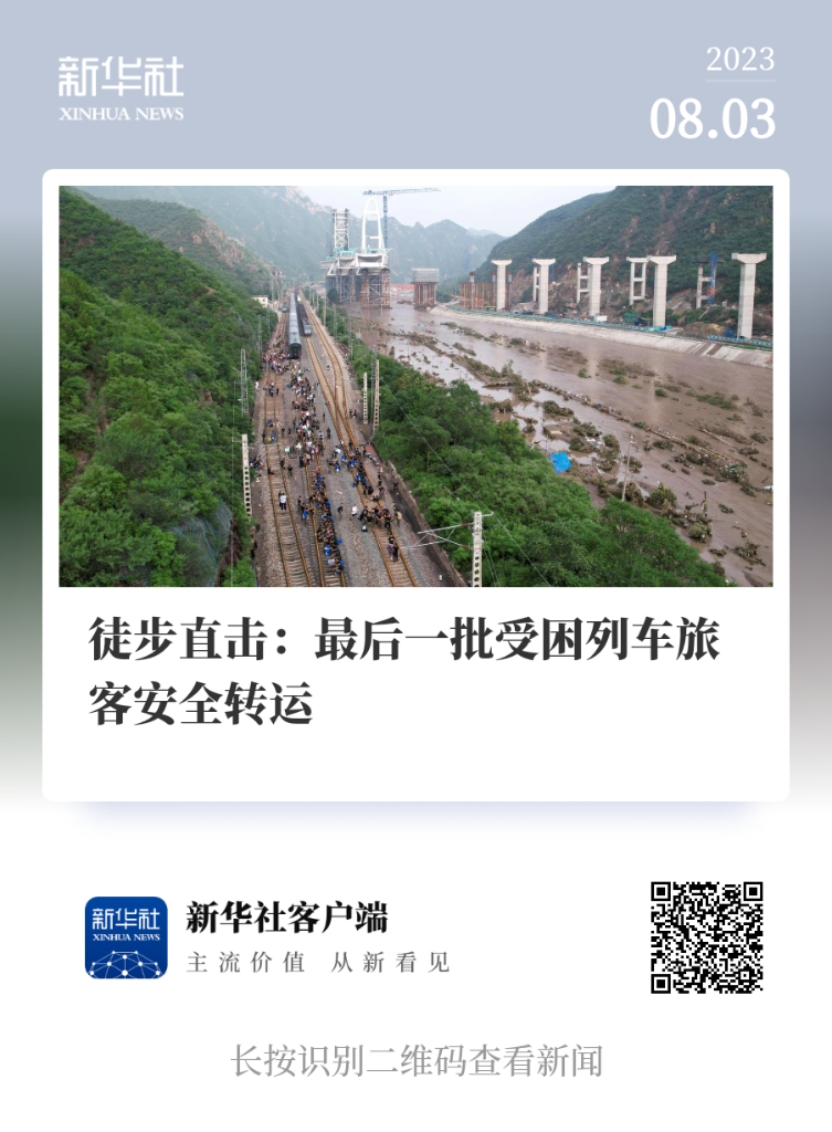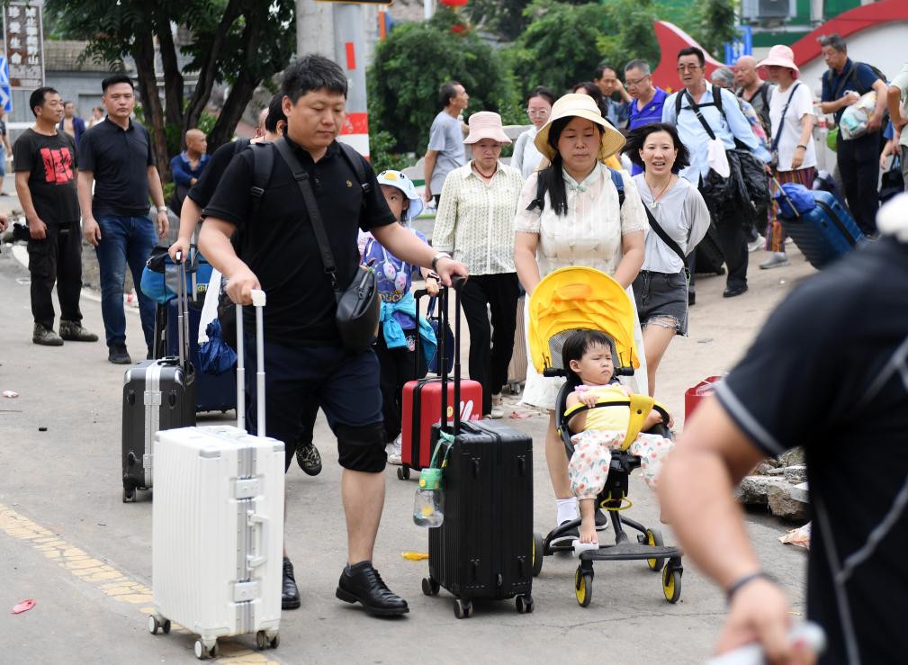 ↑2023年8月2日,Z180次受困列车的旅客离开安家庄临时安置点徒步前往转运客车。