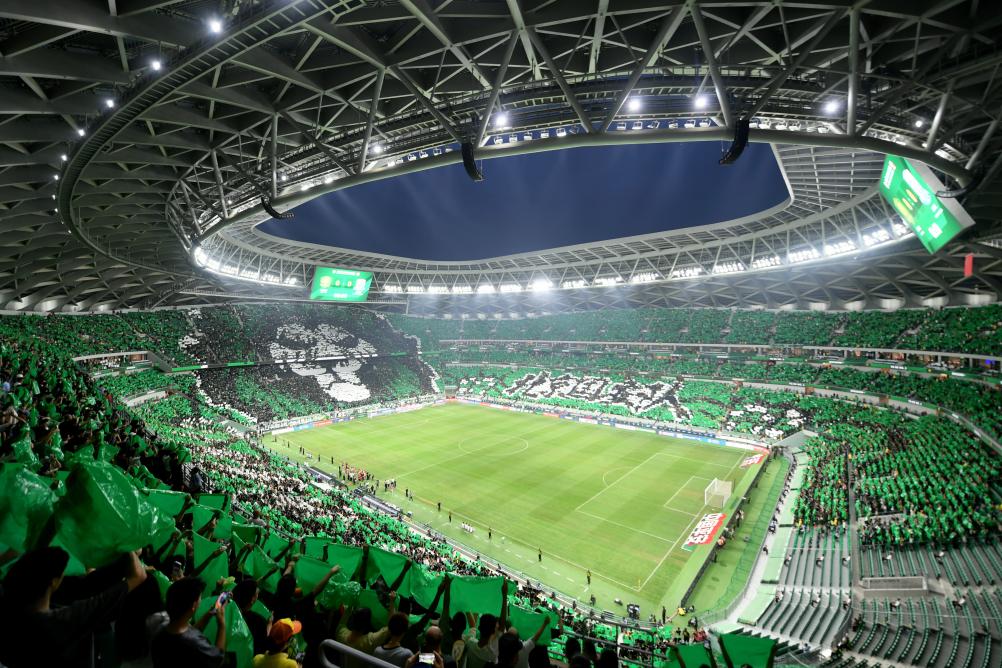 ↑2023年8月19日,球迷在新工人体育场比赛现场摆出助威图案。