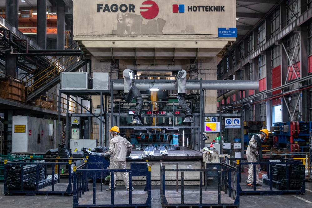 图为重庆两江新区一家机械设备生产企业的热压车间里,工人将刚下线的零件装箱。 新华社记者储加音 摄