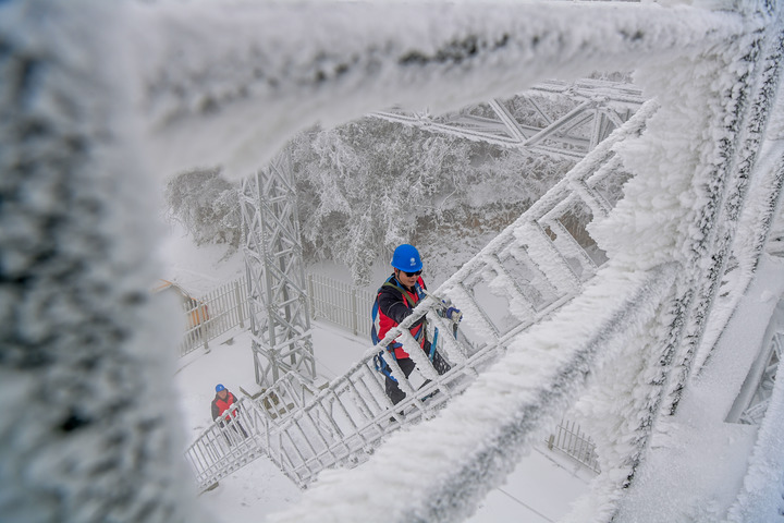 1月23日,在重庆市酉阳土家族苗族自治县涂市镇麻田村,电力工人在覆冰观测点检查覆冰情况。近日,受寒潮天气影响,我国多地迎来降温降雪天气,各地积极组织相关部门开展抗凝除雪工作,保安全保畅通。新华社发(冉川摄)