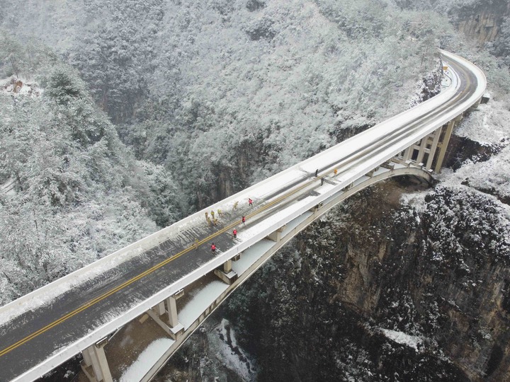 1月22日,青年志愿者在贵州省黔东南苗族侗族自治州施秉县江凯河大桥开展除雪作业(无人机照片)。近日,受寒潮天气影响,我国多地迎来降温降雪天气,各地积极组织相关部门开展抗凝除雪工作,保安全保畅通。新华社发(邰胜智摄)