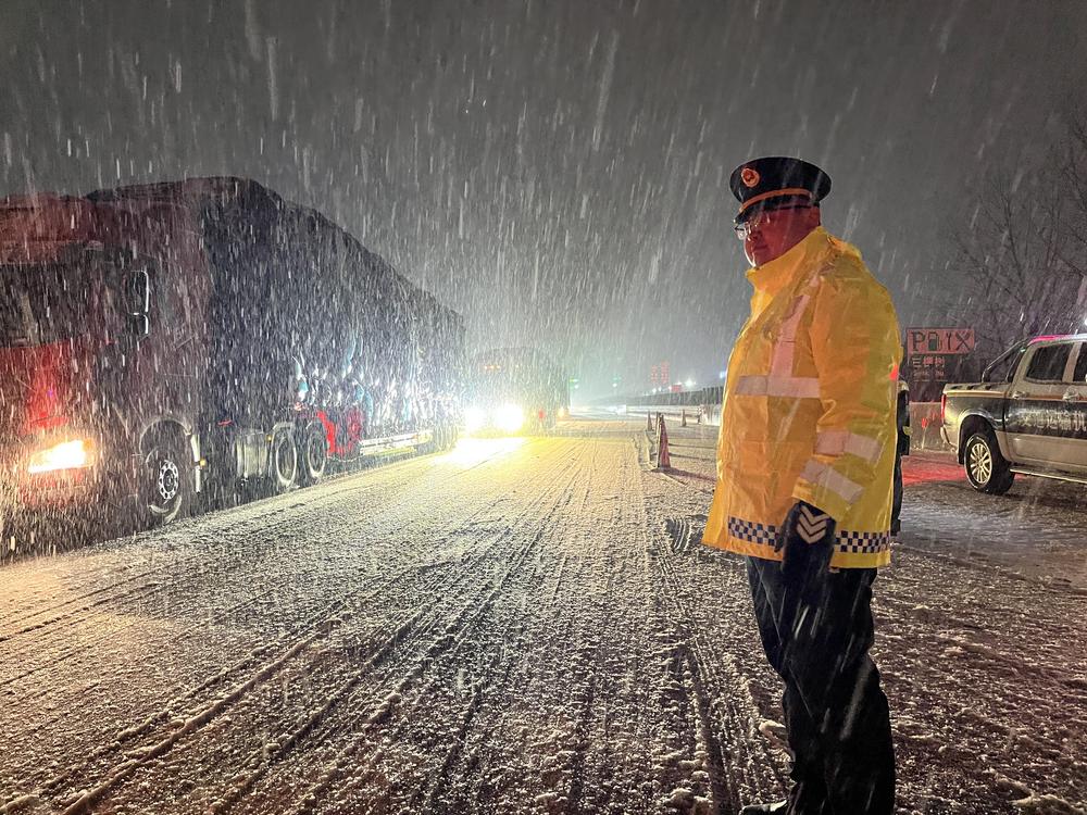 1月21日夜间,执法人员坚守岗位疏导交通。(贵州省交通运输综合行政执法七支队十五大队供图)