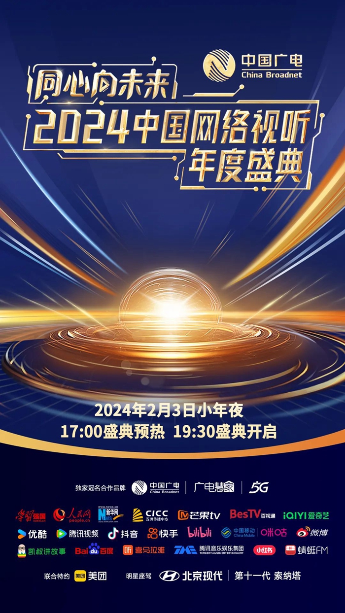由国家广播电视总局指导,中国网络视听节目服务协会、中国电视艺术委员会主办,学习强国、人民网、新华网、五洲传播中心、芒果TV、百视通、爱奇艺、优酷、腾讯视频、抖音、快手、哔哩哔哩、咪咕、微博、凯叔讲故事、百度、喜马拉雅、腾讯音乐娱乐集团、小红书、蜻蜓FM共同承办,中国广电独家冠名的《同心向未来——2024中国网络视听年度盛典》,将于2月3日(腊月廿四)晚19点30分在多平台同步上线播出。