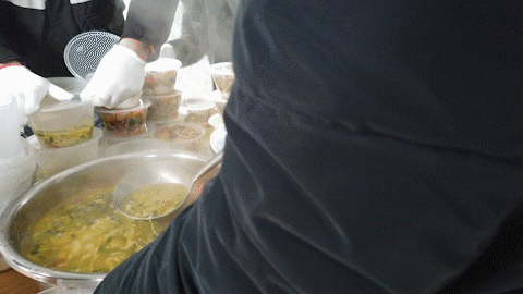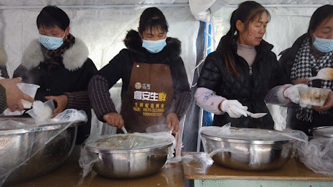 虽然现场还飘着小雪,但临时安置点内却热气腾腾。12时许,工作人员和志愿者端出了刚炒好的回锅肉、西红柿蛋汤等菜品,开始为临时安置群众发放午餐。午餐包含4菜1汤,荤素搭配。