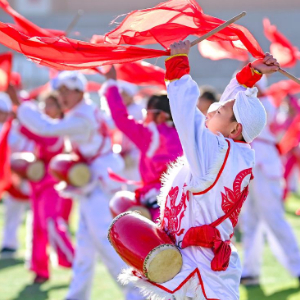 2023年11月16日,内蒙古鄂尔多斯市鄂托克前旗第二小学的学生在大课间表演安塞腰鼓。该校将安塞腰鼓列入学校的校本课程和大课间活动,聘请民间艺人传授技艺,让非遗文化在校园中传承。新华社发(王正摄)
