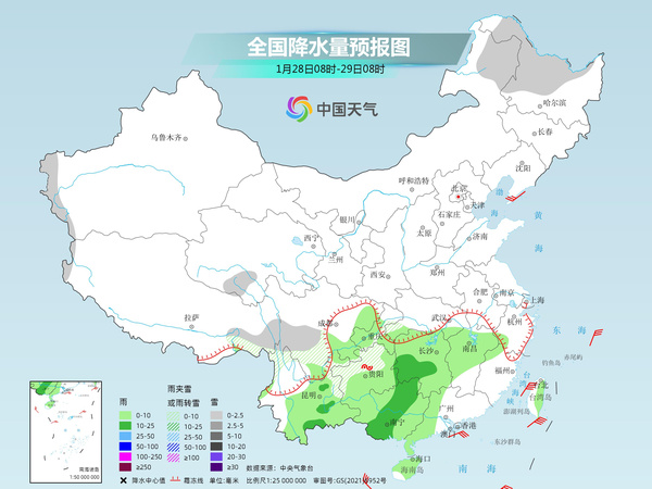 中央气象台预计,今天,新疆南疆西部山区、西藏西部和南部、四川盆地东南部、贵州西北部、云南北部等地的部分地区有小雪或雨夹雪,局地有中到大雪。云南中南部、贵州南部、湖南南部、华南北部和西部等地的部分地区有小到中雨。