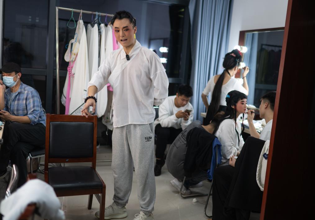 18岁的楚剧演员黎楠戴着粉色兔子发箍,对着镜子仔细调整妆容。“一会儿要表演的楚剧《打饼》是我跟师父学的第一部戏,我饰演武大郎,需要全程蹲着,被称为‘矮子功’,刚开始一天练下来真受不了,偷偷地躺在毯子上哭。”他说。