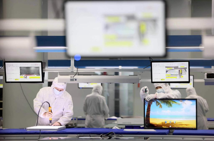 在合肥市瑶海区的中国网谷,一家电子科技公司的员工在智慧显示屏生产线上作业。新华社发(解琛摄)