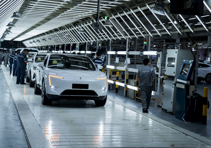 在重庆市长安汽车生产基地车间内,新能源汽车阿维塔生产下线。新华社记者李前磊 摄