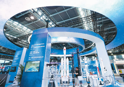 在2023年中关村论坛展览现场,航天科技区域展出了可重复使用液氧甲烷发动机等诸多新成果。本报记者 贺 勇摄