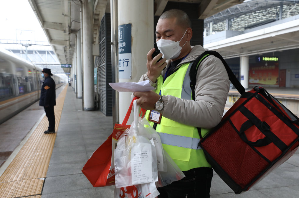 上饶站送餐员万里提前到站台等候,并与列车长联系核对外卖订单信息。(受访者供图)