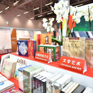 2023年10月18日,参观者经过德国法兰克福书展中国展区。第75届法兰克福书展10月17日晚在德国法兰克福会展中心拉开帷幕。中方出版单位和参展代表携千余种精品图书和出版物参展,并通过十余场精彩纷呈的活动促进中外文化交流互鉴。新华社记者 任鹏飞 摄