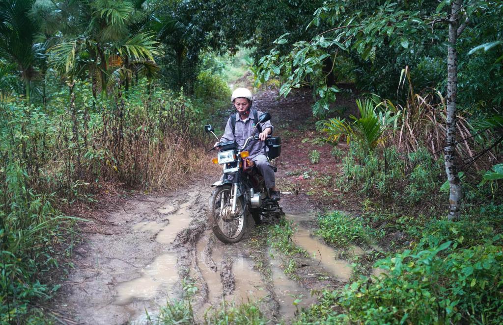 2023年10月18日,正值下雨,上山的路泥泞不堪,摩托车车辙的痕迹深深刻在山路上,连雨水也无法轻易冲刷掉。李文永和同事将摩托车开到半山腰,随后徒步爬上山。上山“如履平地”的他们特意放缓脚步等待我们。