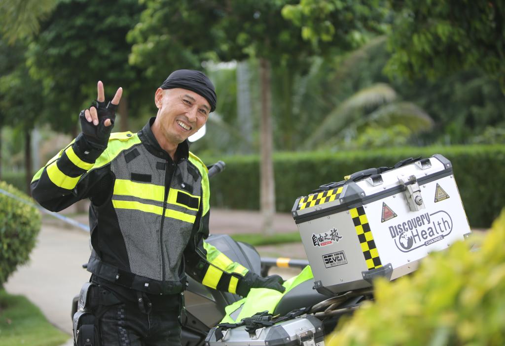 而在老车手占文力眼中,他更关注比赛秩序、交通安全和保障服务。一刻不敢松懈的他随时关注对讲机,保持与赛事执委会的联系,做足应对突发情况的准备。在第二日的琼海-保亭赛段,途径牛岭时遇到风雨的我们只得避雨。待雨稍小,占文力提议继续上路追赶参赛选手,于是我们便在雨中骑行,高速行进时身体感受到的阵阵寒意,在阳光再次出现后才得以缓和。