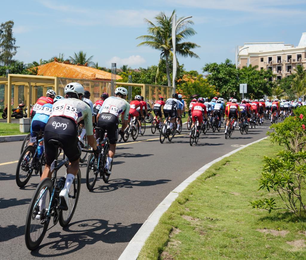 2023年10月5日,车手在比赛中。当日,第十四届环海南岛国际公路自行车赛在琼海市开赛。