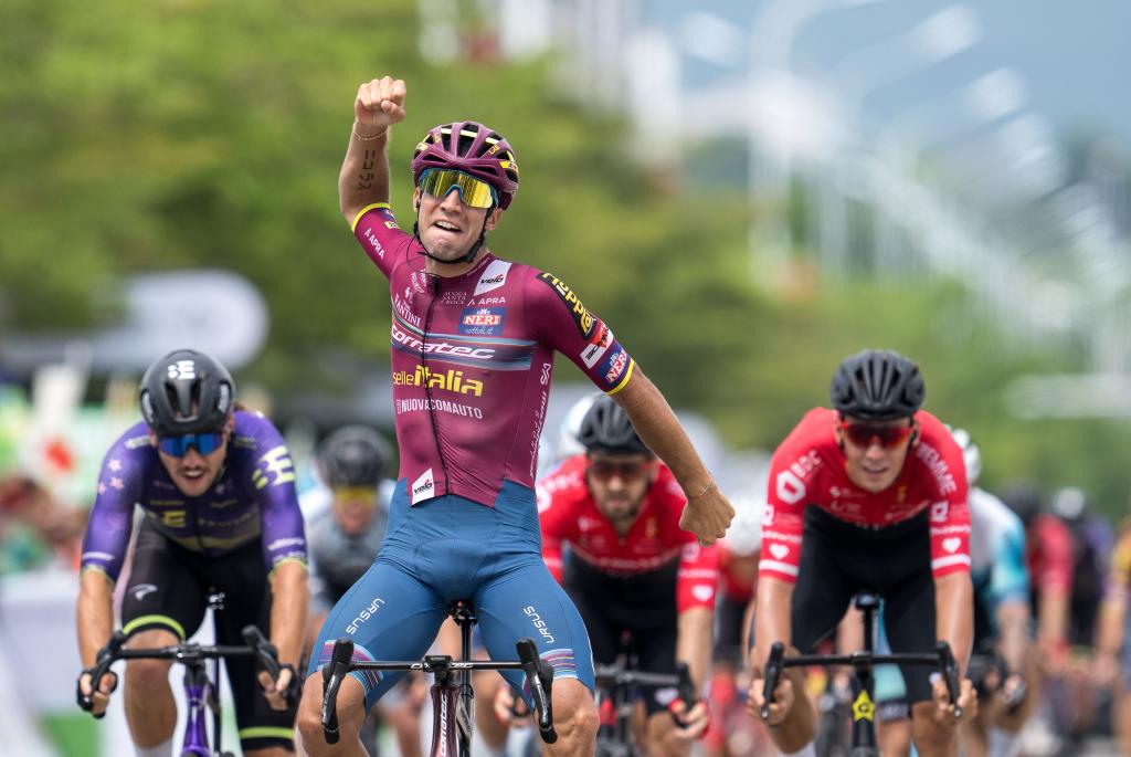 2023年10月8日,意大利克罗蒂克车队车手尼古拉斯(前)率先冲过终点后庆祝。