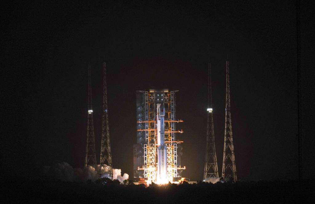 2023年5月10日21时22分,搭载天舟六号货运飞船的长征七号遥七运载火箭,在我国文昌航天发射场点火发射,约10分钟后,船箭成功分离并进入预定轨道,之后,飞船太阳能帆板顺利展开工作,发射取得圆满成功。新华社记者 杨冠宇 摄