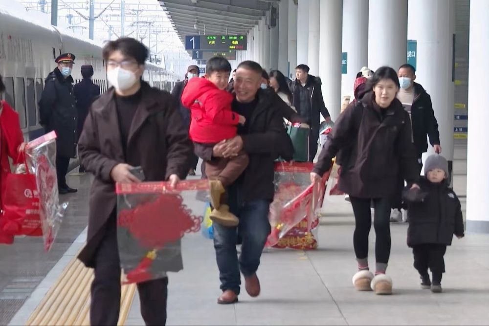 1月30日上午十点半,乘客涌上六安站1号站台,老人怀里抱着穿红色羽绒服的孩子,年轻的情侣手里拿着红色的中国结和对联。记者在人流中登上G7578次列车。