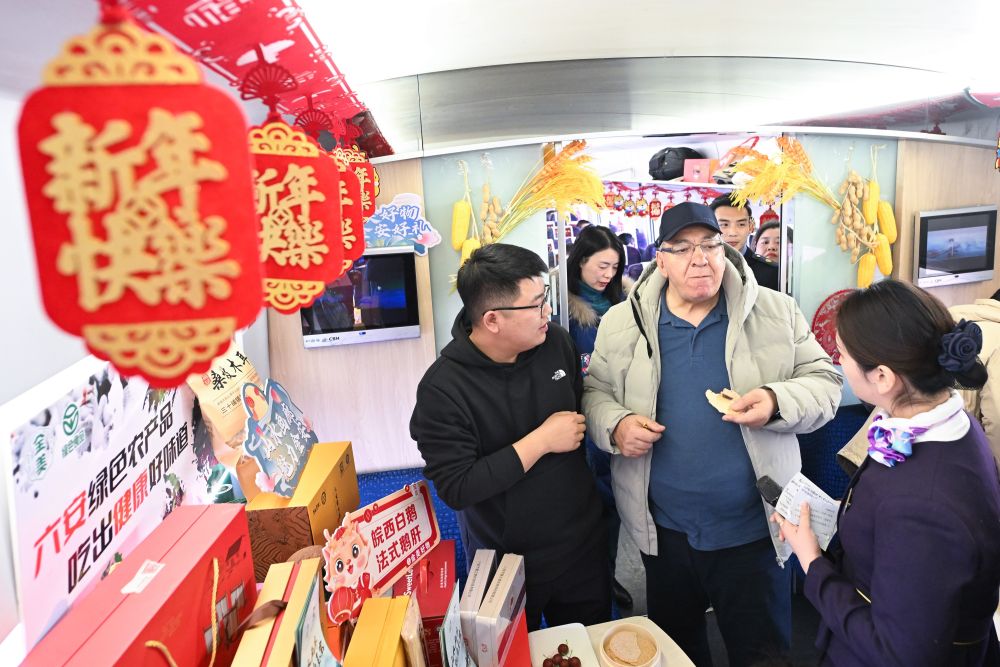 六安瓜片、霍山石斛、皖西白鹅、金寨灵芝……中国铁路上海局集团有限公司南京客运段高一车队列车长曹立斐,帮来自六安的“新农人”把当地农产品摆进餐车,喜庆的灯笼和剪纸映红了车窗——高铁上的年货市集开张,环行长三角的列车也由此启程。