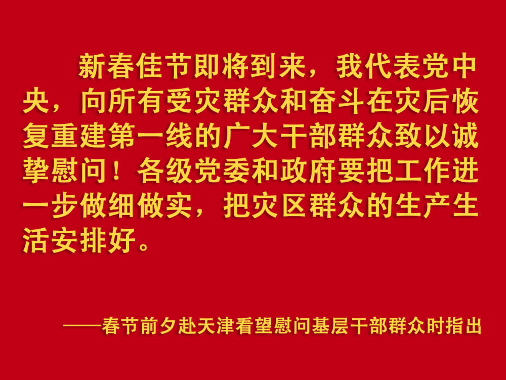 春节前夕,习近平总书记在天津考察调研,看望慰问基层干部群众。2月1日上午,他首先来到西青区辛口镇第六埠村,实地了解去年洪涝灾害后当地农业生产恢复等情况,看望受灾群众。
