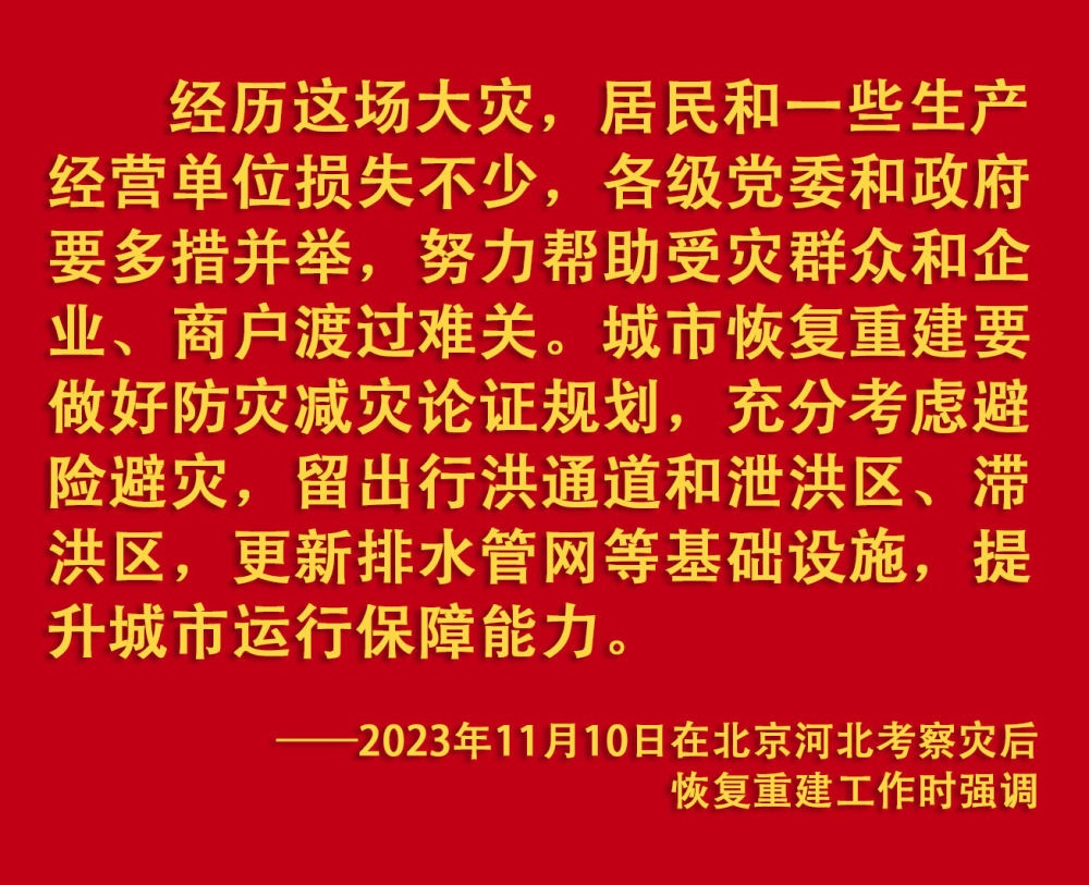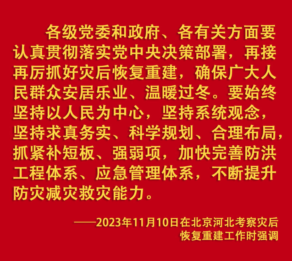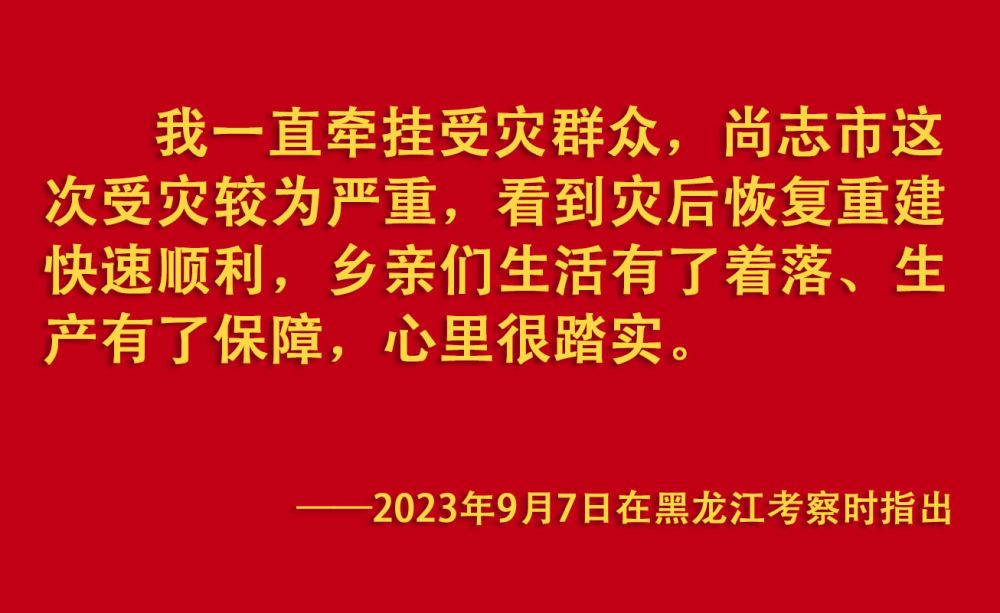 2023年汛期以来,我国华北、东北等地出现极端降雨,引发洪涝和地质灾害。习近平一直牵挂着受灾群众,高度重视防汛抗洪救灾和灾后恢复重建工作,多次作出重要指示批示,要求有关地方和部门全力保障人民群众生命财产安全,尽快恢复灾区正常生产生活秩序。2023年9月上旬,习近平前往黑龙江尚志市看望慰问受灾群众;11月,北方入冬之际,习近平又来到北京、河北受灾较重的相关地区,看望慰问受灾群众,检查指导灾后恢复重建工作。