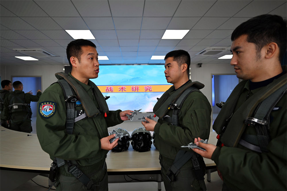 空军航空兵某旅飞行一大队飞行员完成空中对抗后,到战术研究室展开复盘(2023年12月19日摄)。新华社发(余红春 摄)