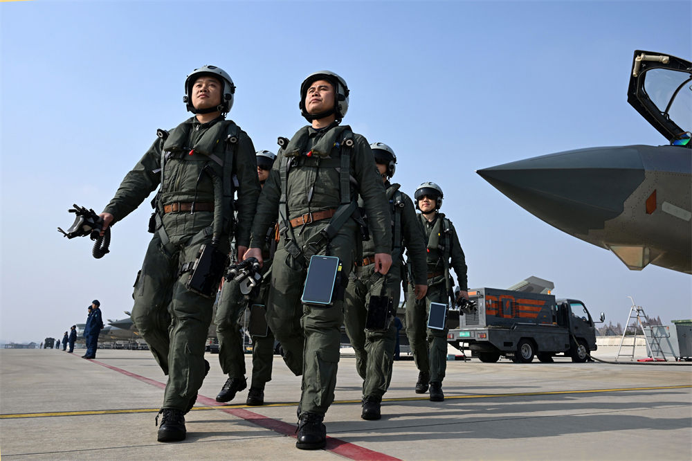 空军航空兵某旅飞行一大队飞行员完成准备走向训练场(2023年12月20日摄)。新华社发(余红春 摄)