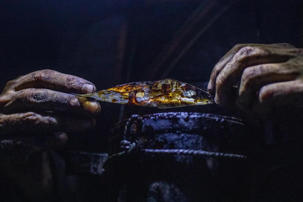 稍事休息,我们跟随文森再次走进深山,迎接收获的时刻。茂密的树林遮住月光,头灯是黑夜里唯一的光源。同样的路,爬上同样的树,文森一点点收获“大木漆”,这是自然的馈赠、时间的礼物。