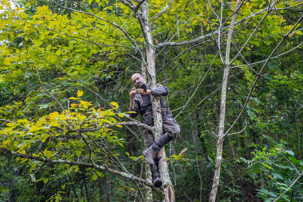 时而爬坡,时而越过泥泞的沟,文森在树林中穿行。他的眼睛迅速锁定目标漆树,轻巧地爬到高处,手起刀落,切割漆口,折放漆茧……整套动作一气呵成。