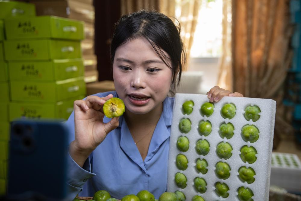 在一间布着补光灯的屋子里,我们见到了正在直播销售巫山脆李的主播刘嘉陵。前年大学毕业的她抓住当地高铁通车的机遇回到乡村,帮助不熟悉网络直播的农户销售水果和农副产品。她说:“我不想让家乡的好东西没有销路,通过网络,我们把品质好的水果销售出去,帮助农户提高收入的同时,我们也收获了更多工作经验。带着这份经验,我们又能更好地帮助他们。”说到这里,我看到嘉陵的眼里闪着希望的光。