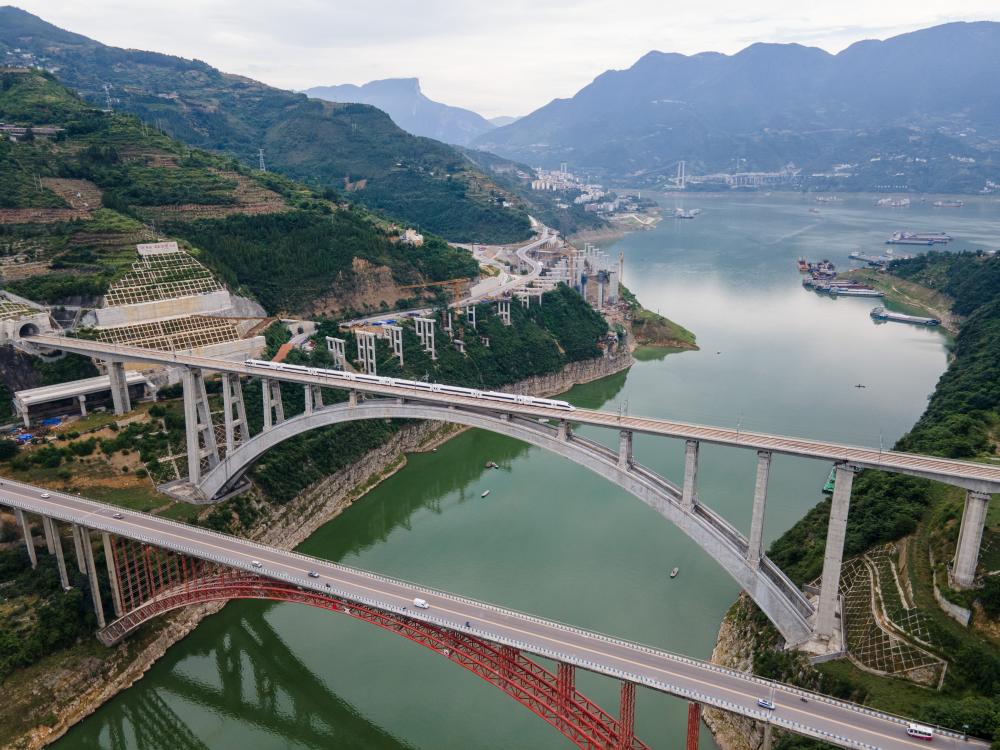 再转场,高铁列车从奉节县梅溪河双线特大桥上呼啸而过,有些旅客选择将巫山脆李作为伴手礼,送给亲友……
