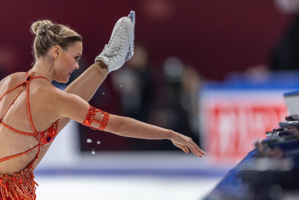 想要拍到选手与背景板上特色元素同框的图片,不论是找准合适的时机,还是找好两者恰到好处的相对位置,对于花样滑冰项目的摄影新手来说都是挑战。