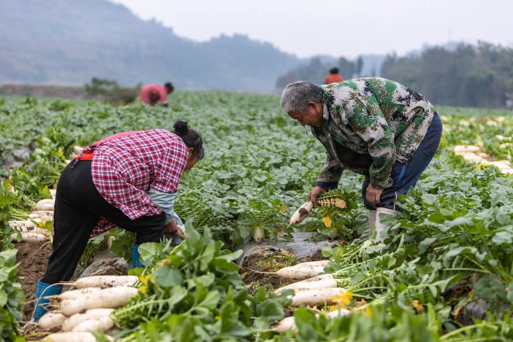 车子在太和镇的山间行驶许久,最终停在了米市村的一家蔬菜种植合作社内,不远处的田里村民正在收获白萝卜。我带着相机走向他们,交谈的声音大了起来,但我并不能完全听懂。本想和他们先聊上两句,穿着红围裙的嬢嬢先开了口,喊我捡上一些回家炖着吃。见我端起相机,村民们纷纷俯下身子、埋起脸,一边讨论着说自己不上相、干活的样子不好看,一边继续麻利地劳作。