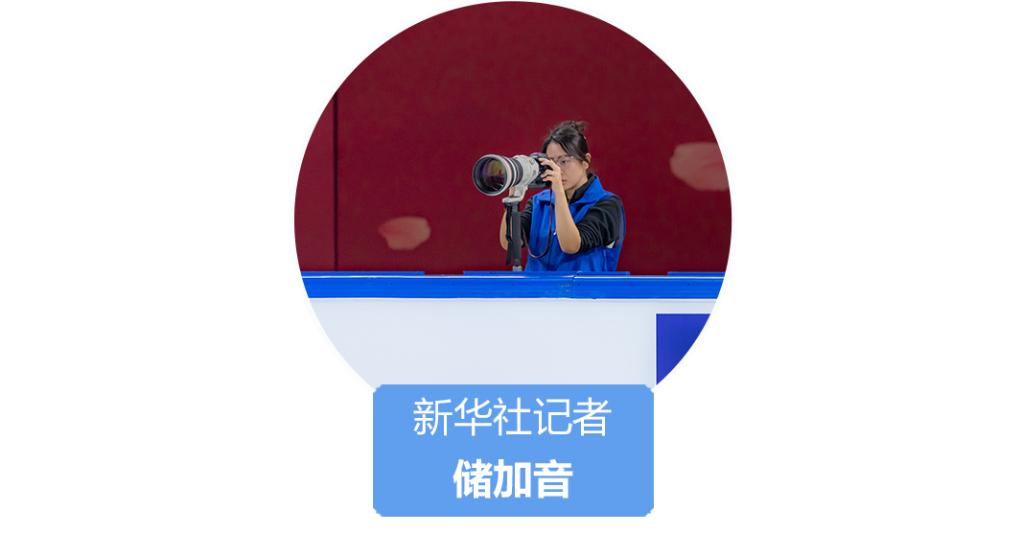 与第一天我所在的拍摄点位不同,1号位处在裁判席的三点钟方向,等分台右侧,并正对以枣红与赤金为主色调的大背景板,上面绘着重庆的“网红”景点洪崖洞,旁边还有一对花滑选手身姿舒展的剪影。