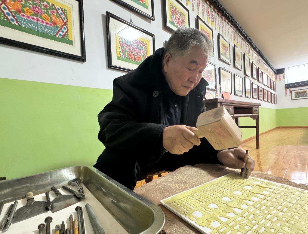 74岁的刘胜余拿着纸锉刀和小木槌,在一摞宣纸上依次凿打出镂空的花朵、铜钱和吉祥话语。儿子刘斌戴着指套,用细杆毛笔为形状各异的宣纸逐层染上颜色……屋里满是叮当敲打和罐罐茶在炉火上滚沸的咕噜声。