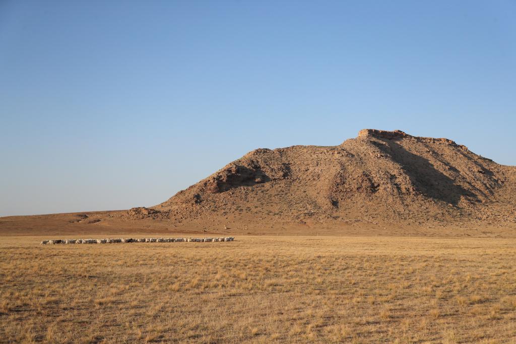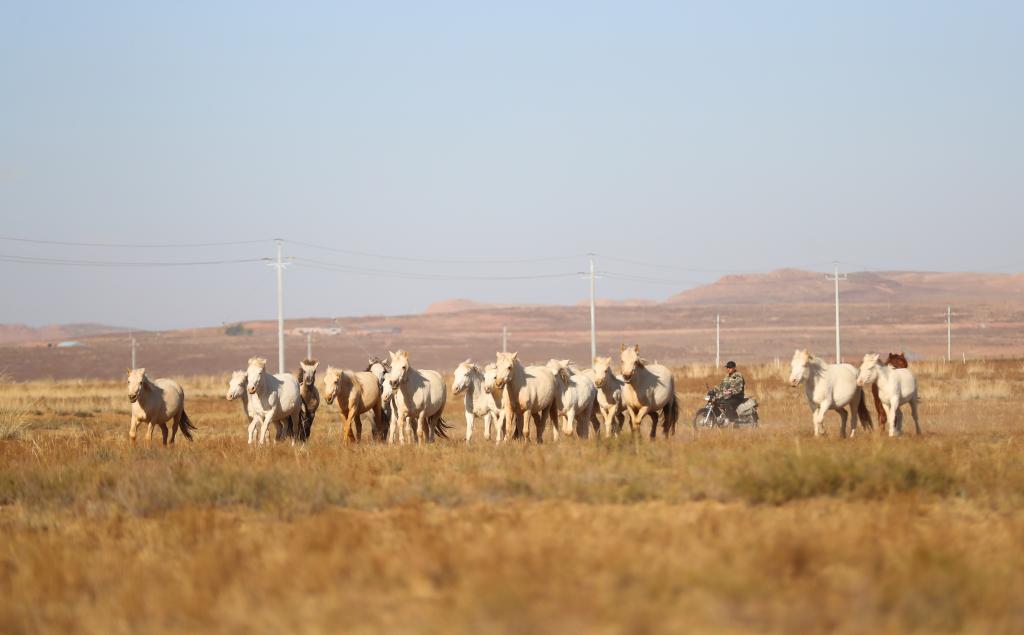 秋天的鄂尔多斯草原上一片金黄,我们又开启了秋日牧歌的旅途。家位于鄂尔多斯市鄂托克旗的牧民道尔吉与91岁的父亲明安宝是我们这次采访的主人公。他们父子既是当地的养羊大户,更是当地“乃日”乐队的核心成员。第二天一早我们启程前往道尔吉家。道尔吉骑着摩托车在草原上驱赶马群,他与马群自由驰骋在天地之间,让我不禁感慨草原上人们的生活竟是如此洒脱。