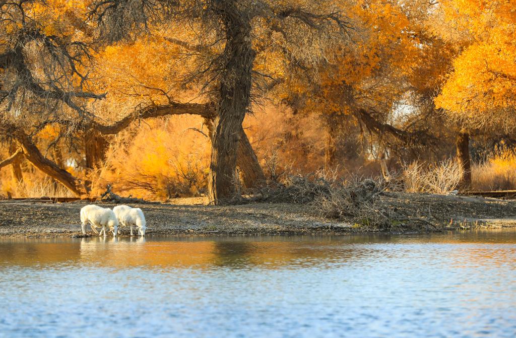 深秋的额济纳,美丽的胡杨林正值金黄。这里的羊群穿梭在林间,不时来到湖边饮水,不时前往林间觅食,一幅美丽的秋日画卷徐徐展开。