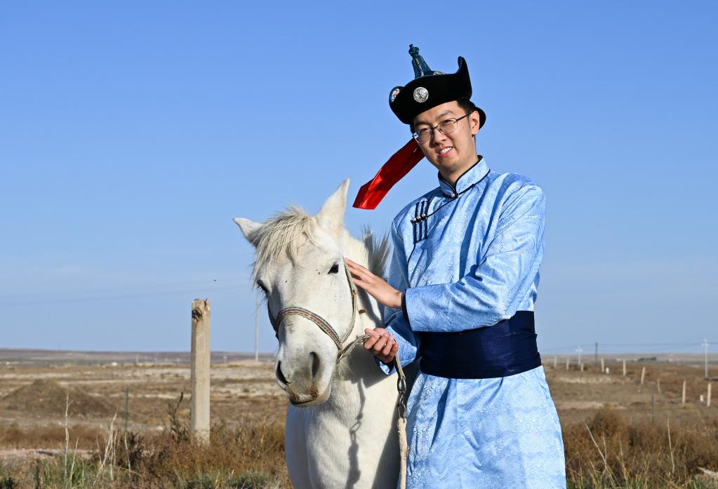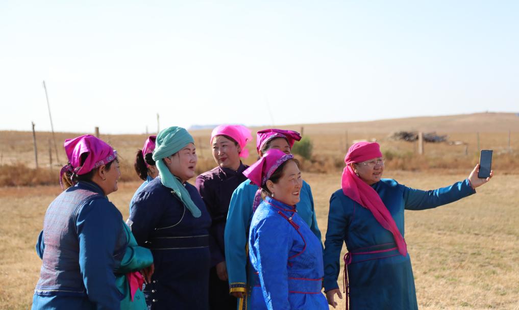 采访结束后,热情的牧民朋友们还纷纷主动过来合影,被快乐感染的我也换上牧民朋友的蒙古袍和白马来了个亲密合影。就这样,在收获的季节里,鄂尔多斯草原上,三弦、四胡、笛子、扬琴齐声奏响,我们和牧民载歌载舞,一首充满爱与幸福的“秋日牧歌”在此奏响。