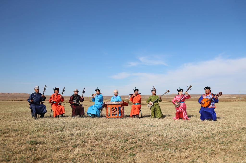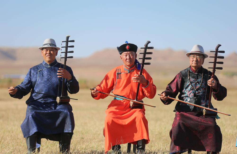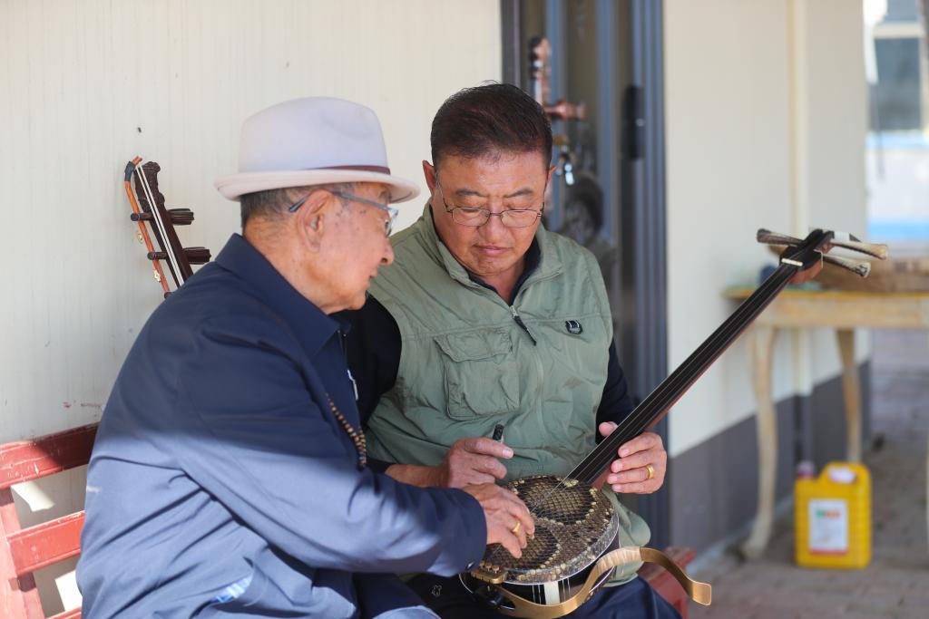 “乃日”可译为“礼乐”“娱乐”“聚会”,起源于元代,是一种以乐器歌舞为主的综合性民间表演艺术,被列入内蒙古自治区级非物质文化遗产名录。2018年,明安宝组织周边老人一同组建了老年人“乃日”乐队,他们定期排练并参加各项演出活动,在传承“乃日”文化的同时,也丰富了牧区老年人的精神文化生活。明安宝说:“自从有了这个乐队,我们有空就一起练习,比原来打麻将有意思多了。”