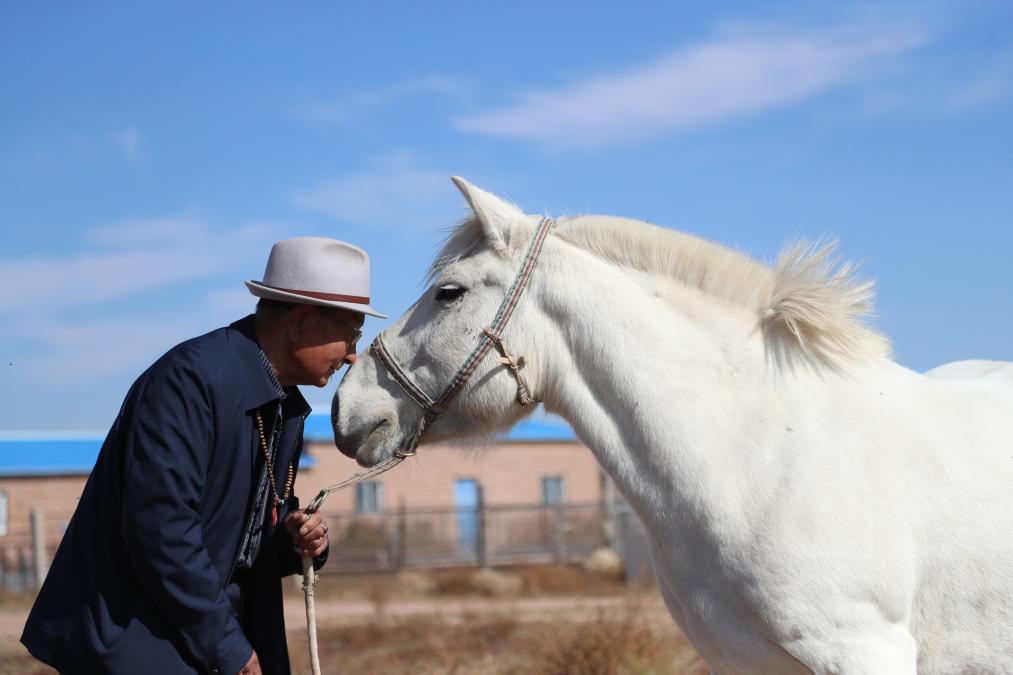 午饭时间,一家人忙活着“全羊宴”,明安宝放下了琴,起身到院子里闲逛。我不敢怠慢,直觉告诉我要时刻跟紧采访对象,做到“相机不离手”。只见他来到自家的马圈前,想用骑马庆祝一下今天的好心情。马,对于牧民不仅仅是交通工具,更是一种精神寄托。明安宝并不是直接骑上马,而先是俯下身子亲吻马的额头,就像好友重逢的一个拥抱,而白马也眨眨眼,给予回应。