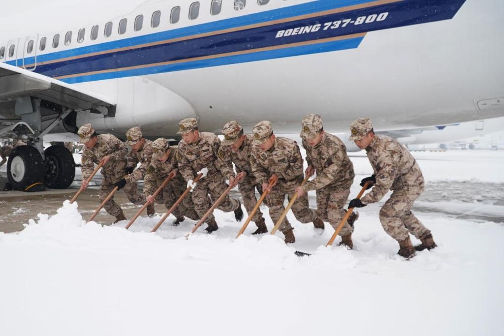 武汉支队官兵在武汉天河机场清扫积雪,全力保障航班恢复运行。邹仁科 摄