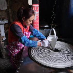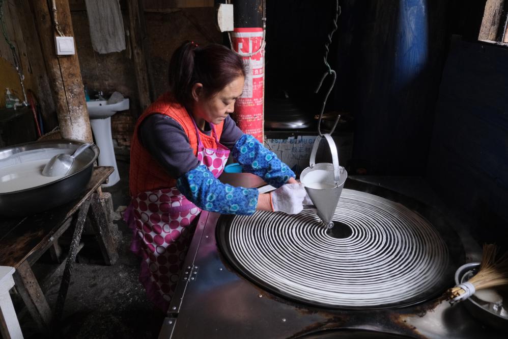 随后,颜道琼熟练地将磨好的浆汁倒入特制的容器中,自容器底端流出的浆汁在一口不断旋转的平锅上被烙干后变成条状,放置片刻后装袋存放,食用时用开水烫热即可。颜道琼介绍,除夕夜不少黔江人会选择吃上一碗方便又营养的绿豆粉。