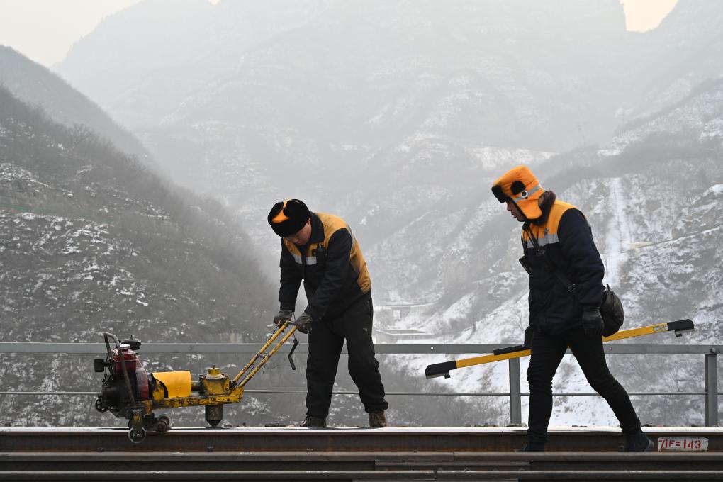 在线路一侧,这些“00”后按照各自分工,三两一组,有的负责紧固松动的扣件、有的负责测量。莫说冬天无颜色,远远望去,这些明黄色的工装犹如点缀在山间的迎春花。(记者史林静)